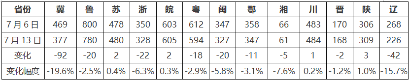 截至7月13日,重点监测省份生产企业库存总量为5086万重量箱 ,较上周四库存下降224万重量箱,降幅4.22%,库存环比降幅扩大4.14个百分点,库存天数约24.83天,较上周减少1.25天(注:本期库存天数以截至本周四样本企业在产日熔量核算)。本周重点监测省份产量1313.36万重量箱  ,消费量1537.36万重量箱,产销率117.06%。