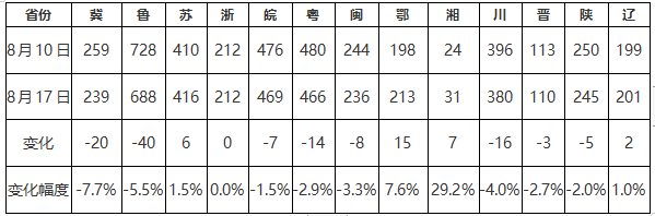 截至8月17日,重点监测省份生产企业库存总量为3906万重量箱,较上周四库存下降83万重量箱,降幅2.08%,库存环比降幅缩小7.71个百分点,库存天数约19.11天,较上周减少0.40天(注:本期库存天数以截至本周四样本企业在产日熔量核算)。本周重点监测省份产量1311.00万重量箱,消费量1394.00万重量箱,产销率106.33%。